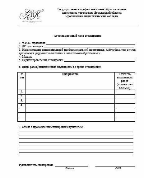 Стажировка проводится на базе ГПОАУ ЯО Ярославского педагогического колледжа в очном формате по теме одного практического модуля программы повышения квалификации, который был заявлен слушателем при регистрации.